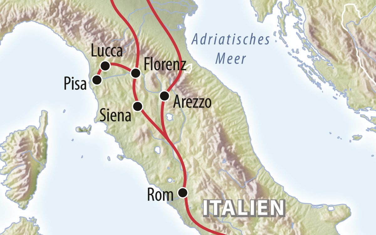 Italien – wer denkt da nicht an das Land der immergrünen Zypressen, malerischen Dörfer, quirligen Städte, einzigartigen Kunstschätze und weltberühmten Weine? Sie lernen auf dieser Rundreise den tiefblauen Gardasee und die Toskana mit ihren schier unzähligen Kunststädten wie Pisa, Lucca und Florenz kennen. Natürlich darf das großartige Rom dabei nicht fehlen. Entdecken Sie „Bella Italia“ mit seiner Lebensfreude und der vielseitigen Landschaft.