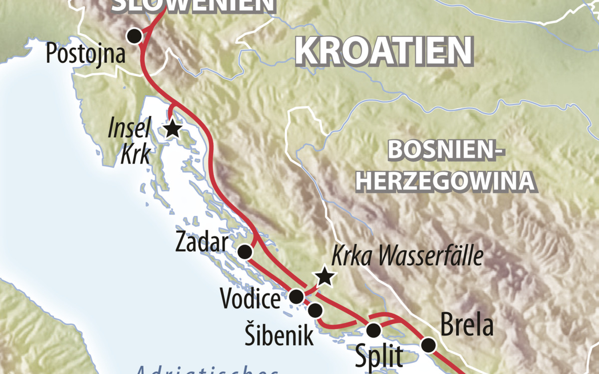 Entlang der Adriaküste – von der Kvarner Bucht nach Dalmatien – bietet sich ein einzigartiges Landschaftsbild: Unterwassergebirge, deren Gipfel sich als schmale Inselketten erheben und verträumte Buchten mit Fels-, Kies- und Sandstränden formen. Im Hinterland sind Naturwunder wie die Krka Wasserfälle zu bewundern. Zauberhaft wirkt Dubrovnik mit seiner faszinierenden Altstadt, Zadar mit seinen Kirchen und Split mit seinen Zeugnissen aus römischer Zeit.
