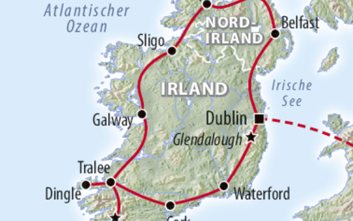 Inmitten des rauschenden Atlantiks, des wärmenden Golfstroms und der Keltischen und Irischen See erstrahlt „Emerald Isle“ – die smaragdgrüne Insel Irland. Von der Herzlichkeit der Menschen, der atemberaubenden Küste der Cliffs of Moher, der märchenhaften Kylemore Abbey und vielem mehr werden Sie auf dieser einzigartigen Reise begeistert sein.