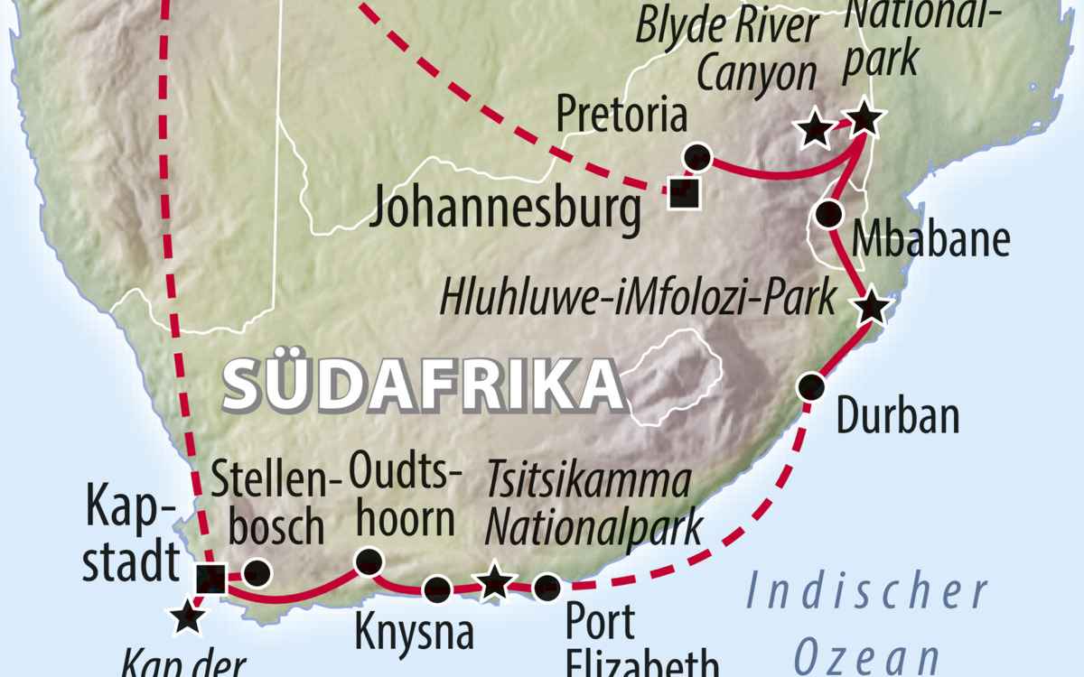 Das südlichste Land Afrikas bietet ein faszinierendes Kaleidoskop an Landschaften, das seinesgleichen sucht: Himmelhohe Berge im Nordosten, liebliche Hügel im Land der Zulu, tiefblaues Wasser am Atlantik, traumhafte Buchten am Indischen Ozean und endlose Wüsten. Wildreservate und Naturparks sowie Städte wie Johannesburg und Kapstadt erwarten Sie auf dieser Rundreise. Südafrika – das ist lebendige Kultur, ursprüngliche Natur und kulinarischer Genuss.