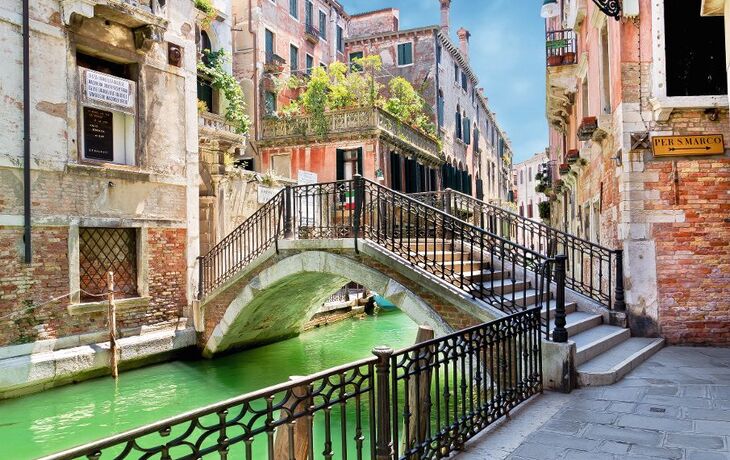 Eine Stadtführung bringt Ihnen die Basilika di San Marco, Seufzerbrücke, Piazza San Marco, Canal Grande und Rialtobrücke näher. Danach haben Sie Zeit für eigene Erkundungen. Verwinkelte Gassen, (F)