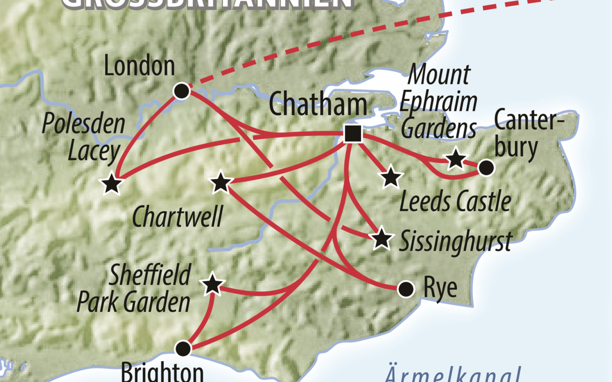 Flug von Berlin nach London. Zum Auftakt Ihrer Reise besichtigen Sie das prunkvolle Anwesen Polesden Lacey, in dem schon Queen Elizabeth ihre Flitterwochen verbrachte. Das Herrenhaus mit weitläufigem Garten ist ein Meisterwerk Edwardianischer Zeit, die sich besonders im Goldenen Salon widerspiegelt. Anschließend fahren Sie durch die sanfte Hügellandschaft Südenglands zu Ihrem •••• Hotel nach Sevenoaks bzw. Chatham. (A)