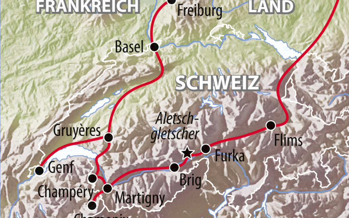 Lebensader des Kanton Wallis ist das reizvolle Rhônetal. In dem Tal voller Kontraste gedeihen Weinreben, sprudeln Thermalquellen und stehen stolze Burgen an Passübergängen vor eis- und schneebedeckten Gletschern. Hier ragen die höchsten Gipfel der Schweiz in den Himmel. Zugleich präsentieren sich Ihnen Städte voller Geschichte wie Basel, Brig oder Genf. Fahrten mit dem Mont-Blanc Express und der legendären Furka-Dampfbahn bieten Eisenbahnromantik pur!