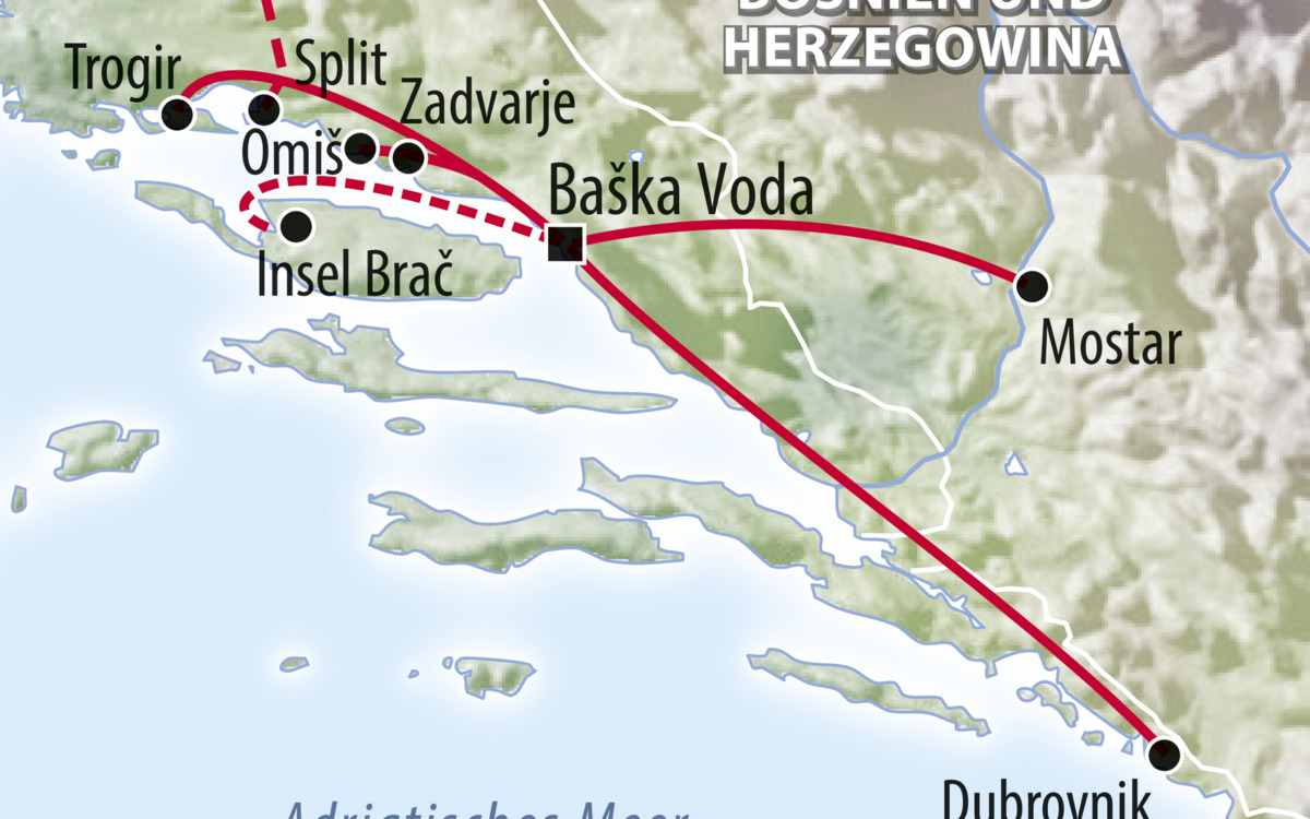 Zwischen kristallklarem Wasser, einladenden Stränden und dem eindrucksvollen Küstengebirge verläuft Kroatiens Adriaküste. Von Split an reihen sich unzählige Inseln wie Perlen einer Kette entlang der Küstenlinie aneinander. Zum Erkunden und Verweilen laden hübsche Hafenstädte und kleine Fischerorte ein. Freuen Sie sich auf lebendige Traditionen, dalmatinische Köstlichkeiten und die überwältigende Gastfreundschaft der Einwohner.