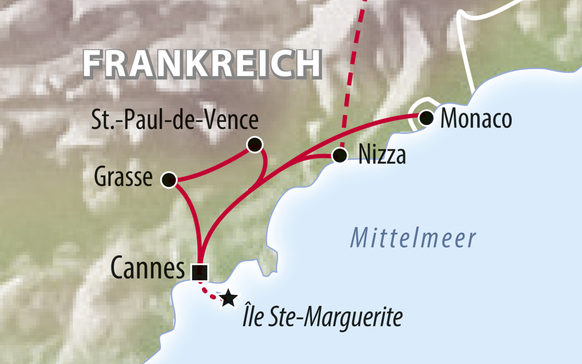 Elegante Strandpromenaden, Städte mit Glanz und Glamour, aber auch wilde Buchten und reizende malerische Dörfer – das ist die Côte d’Azur, Sehnsuchtsort im Farbenrausch. Das satte Blau des Meeres und das unvergleichlich weiche Licht bringen nicht nur Romantiker ins Schwärmen. Besuchen Sie mit uns Nizza, Monaco und die Parfümstadt Grasse. Genießen Sie die entspannte Lebensart und freuen Sie sich auf erlebnisreiche Tage an der französischen Riviera.