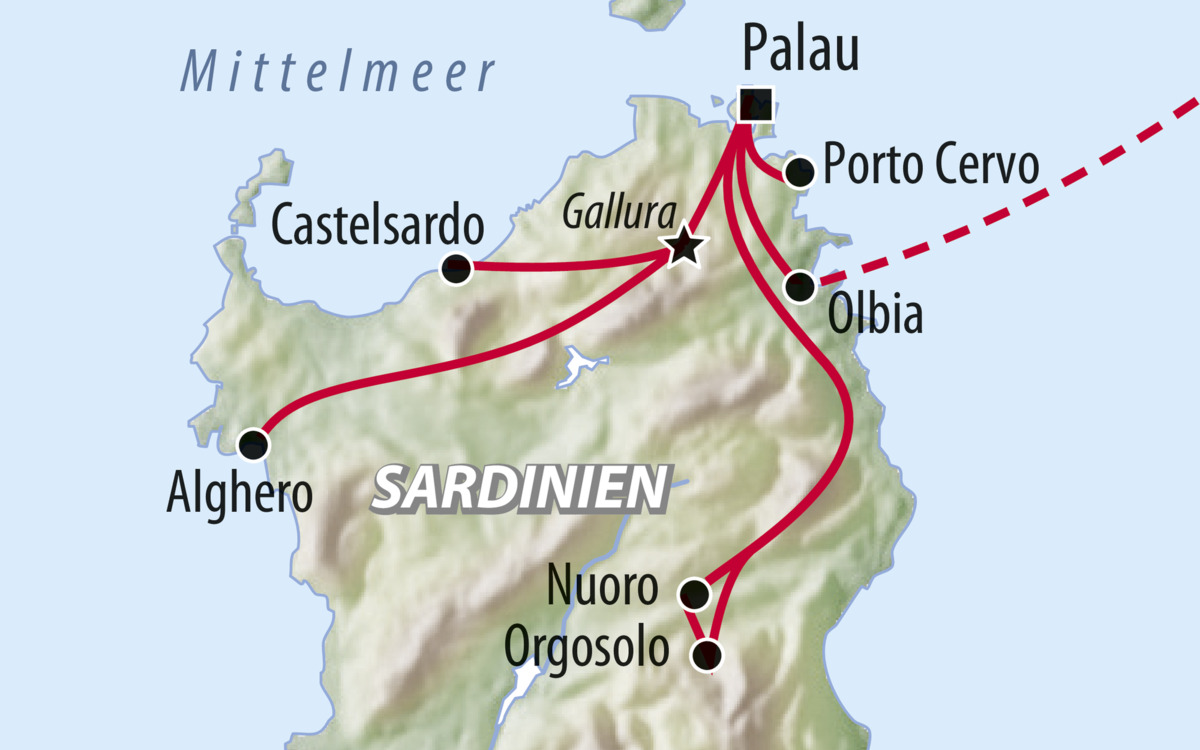 Flug von Berlin nach Olbia und Transfer in Ihr •••• Hotel. Hier werden Sie zum Abendessen erwartet. (A)