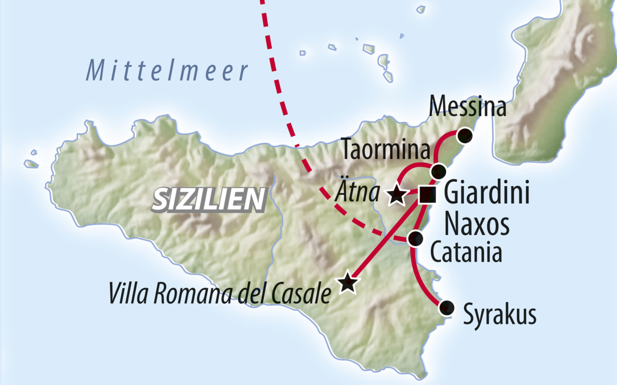 Flug von Berlin nach Catania. Danach erfolgt der Transfer in Ihr Hotel in Giardini Naxos. (A)