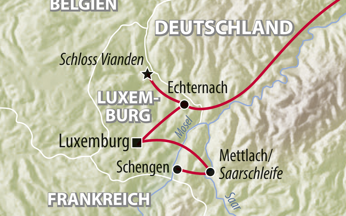 Luxemburg ist von jahrhundertealter Geschichte und zugleich von moderner Architektur geprägt. Zwischen Tradition und Moderne überrascht das kleine Land im Herzen Europas nicht nur mit seiner kosmopolitischen Hauptstadt, sondern auch mit idyllischen Orten und verträumten Tälern zwischen Mosel und Ardennen. Lassen Sie sich in diese malerische Landschaft mit ihren bezaubernden Schlössern, reichen Kulturgütern und herrlichen Spezialitäten entführen.