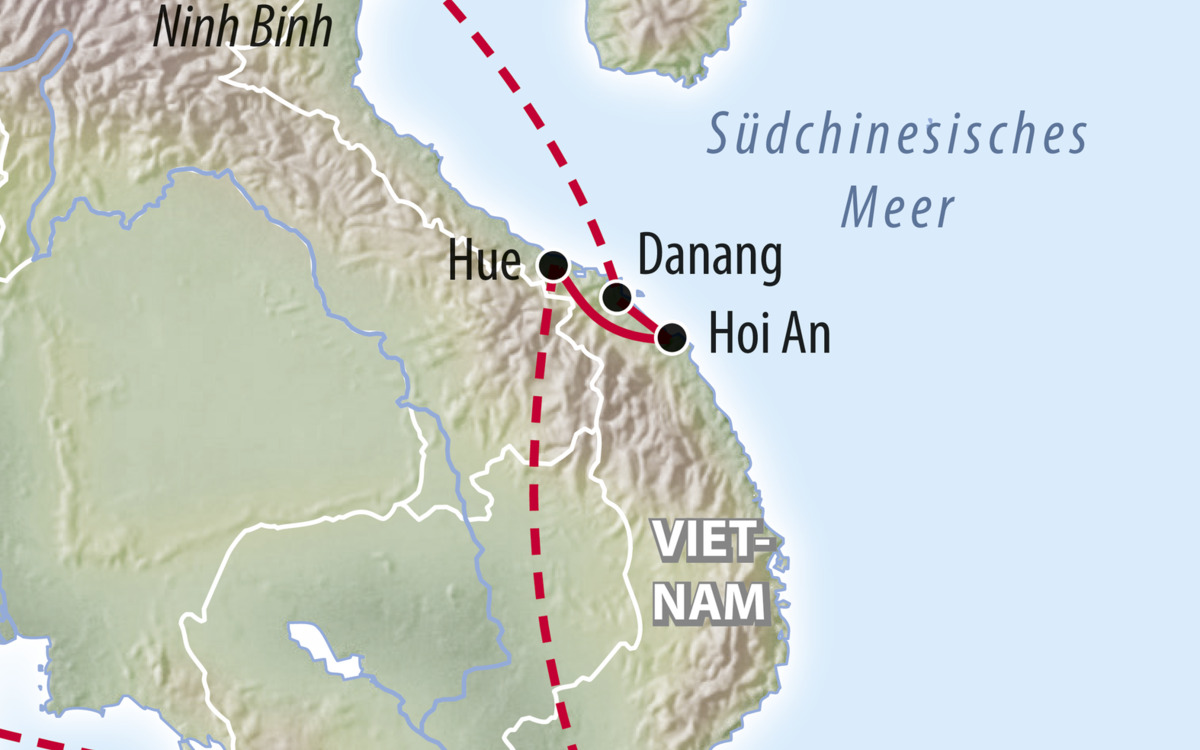 Erleben Sie das Landleben hautnah bei einer Bootsfahrt durch die mystische Trockene Halong Bucht. Von Hanoi fliegen Sie anschließend nach Danang und fahren weiter nach Hoi An, eine charmante Stadt zwischen Tradition und Moderne. (F, A)