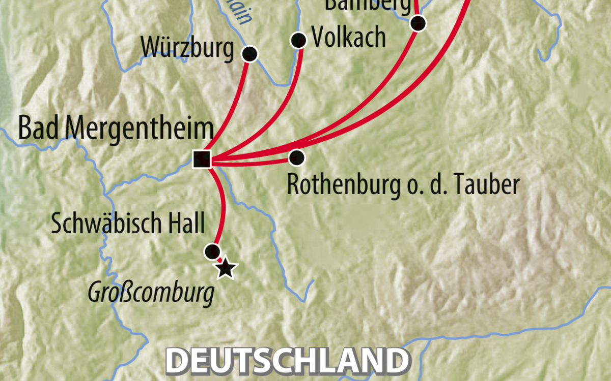 Wie ein Bilderbuch führt Sie diese Reise von einem Schmankerl zum anderen. Eindrucksvoll reichen sich mittelalterliche Fachwerkstädte, Burgen und die Weinberge des lieblichen Taubertals die Hände und spiegeln dabei die deutsche Geschichte wider wie kaum eine andere Region. Eine Schifffahrt entlang der herrlichen Main-Landschaft und Ausflüge nach Würzburg, Volkach und Rothenburg o. d. Tauber bringen Ihnen die Vielfalt Frankens nahe.